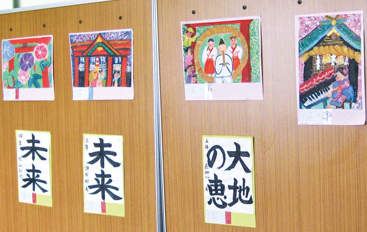 白笹稲荷に展示されているのは、影美会アートアカデミー鶴巻校に通う生徒19人の作品。書道作品に加え、社やお参りする人、茅の輪くぐり、節分を描いた絵など、子どもたちが一生懸命制作した作品が並ぶ。