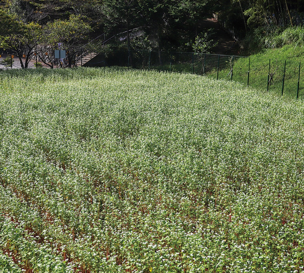この畑は同店に協力する「石庄庵 里山会」の会員らが8月下旬に種まき作業を行い丹精込めて育ててきた。花は10月上旬まで楽しめるという。11月には収穫され、12月初旬に今年の秋そばの新そばとして来店者に提供される。