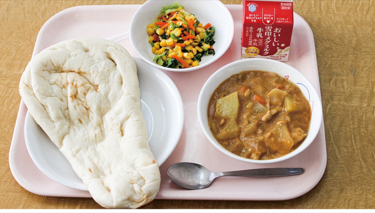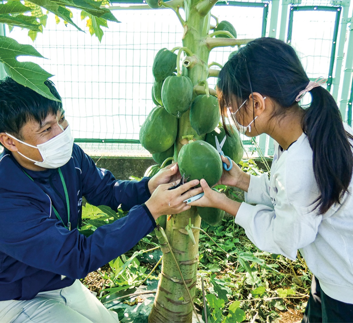 その後、収穫した青パパイヤを給食室に運びこみ納品。職員は「おいしく調理します」と受け取った。お昼になると4年生の収穫物も使われているメニュー「青パパイヤと鶏肉のカレーシチュー」が提供され、子どもたちは「お肉が柔らかい」「味がしみ込んでいる」などと話し、おいしそうに頬張っていた。