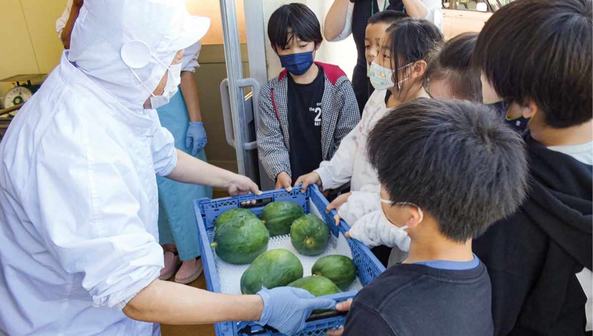秦野市立鶴巻小学校で10月20日、4年生による青パパイヤの収穫と、青パパイヤを使った給食の全校児童への提供が行われた。