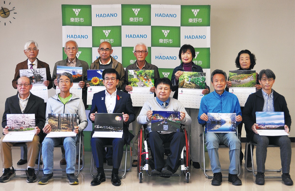 「HADANOカレンダー2023」の贈呈式が10月20日、秦野市役所で行われた。秦野市は市の魅力を広くアピールするため、市内の魅力ある風景や季節の写真で綴ったカレンダーを毎年作成し販売している。来年2023年のカレンダーは、「私が好きな秦野の風景」をテーマに市民から写真を公募。応募総数158点の中から13点が選ばれた。贈呈式には、カレンダーの写真に採用された撮影者11人が出席し、カレンダーの完成品が贈られた。まほろば大橋を撮影した作品が表紙に選ばれた小松均さん(59)は「撮影の時間にこだわり、何度も取り直した作品。表紙に選ばれるのは初めてで驚いた」と喜びを語った。