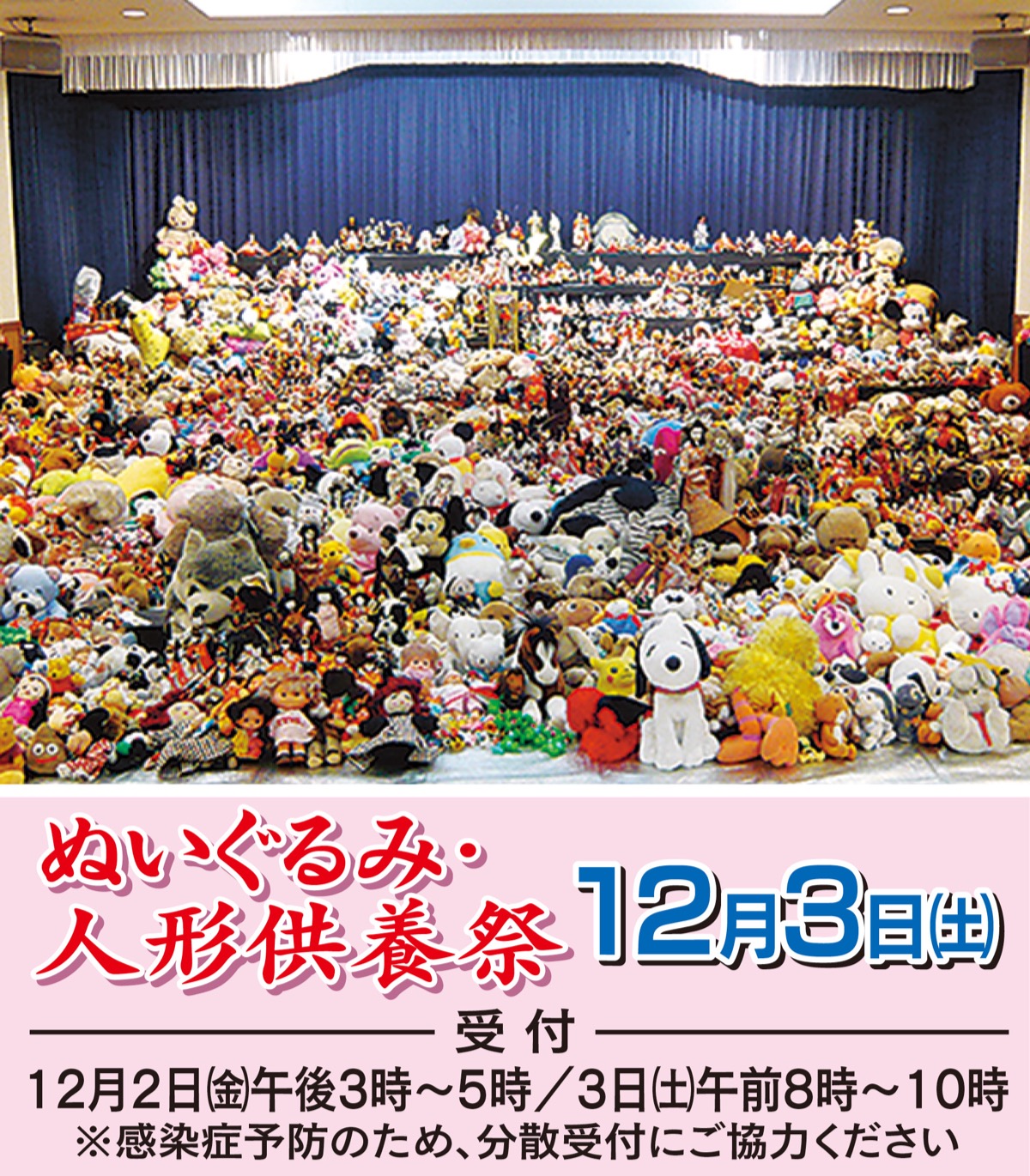 当日は午前11時から僧侶による供養式が執り行われる。ぬいぐるみ・人形が対象で、供養費用は1体2百円(ダンボール1箱2千円)。三月・五月人形も受付(ガラス・陶器製の人形、ガラスケース、付属品不可)。
