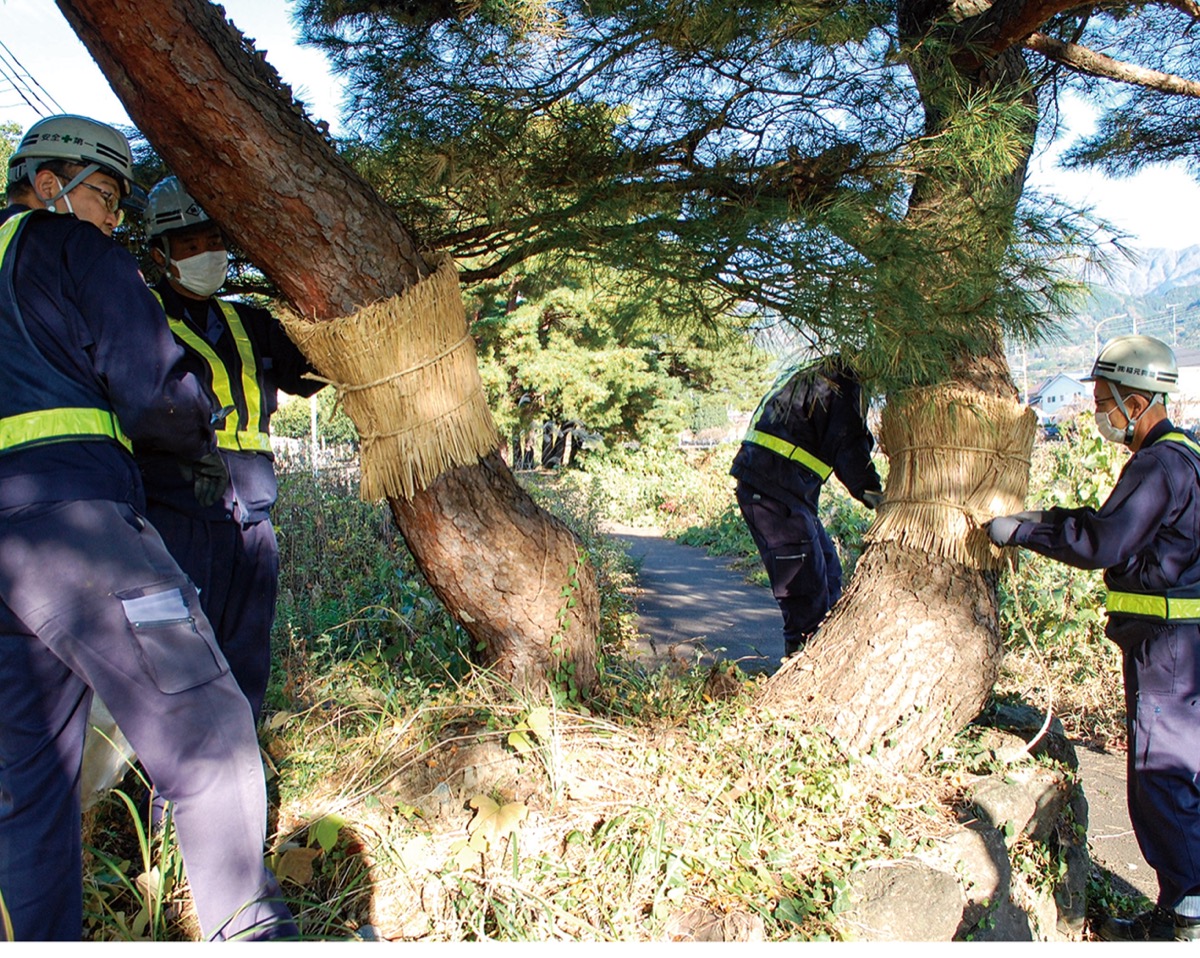 こも巻きは霜が下りるほど冷え込みが厳しくなる季節に、木を寒さから守るとともに、松の葉を食べるマツケムシが冬の間暖かい場所に集まる習性を利用し、藁に虫を集めて駆除するために行われるもの。「地域貢献の一つとして実施した。地域の木として大切にしたい」と同社は話す。