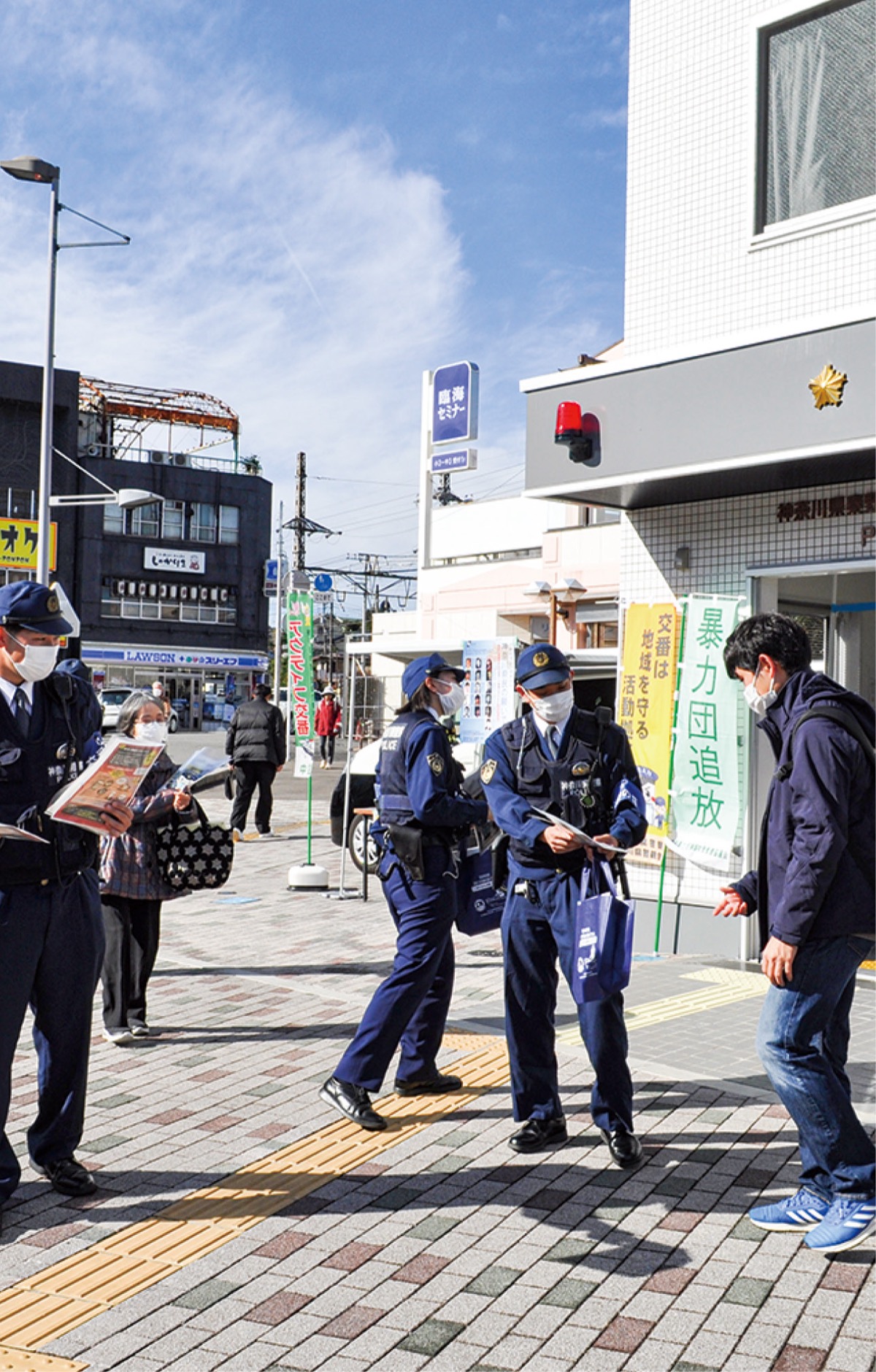 東海大学駅前交番で11月24日、交番の日にちなんだ啓発活動が行われた。当日は秦野警察署の岩渕浩二署長ほか署員、一般社団法人神奈川県警親会秦野支部の役員ら11人が参加。交番の役割を書いたチラシや特殊詐欺、交通安全等の啓発グッズなどを、近くを通行する高齢者や学生などに配布した。