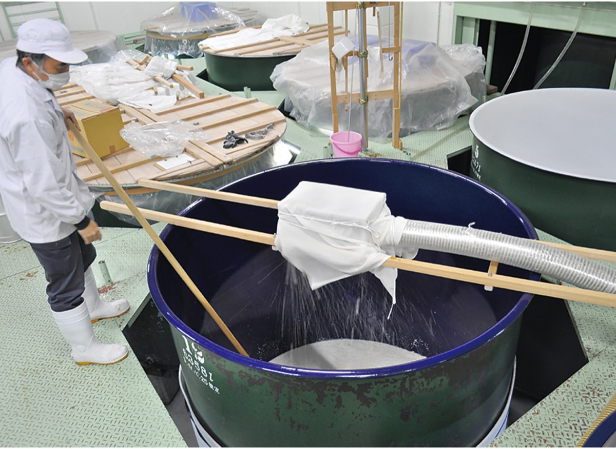 11月19日には、もろみの仕込みが行われていた。タンクに酒母・麹・掛米(蒸し米)・水を混ぜ発酵させる作業で、掛米投入中は米が固まらないよう巨大なタンクの中を常に櫂棒でかき回し続けなければならない。この際徐々に、しっかり発酵させるため、これらを3回に分け投入する日本酒独特の手法「三段仕込み」が用いられる。酒の味を決める重要な工程の一つとなるため、温度管理も肝要となる。