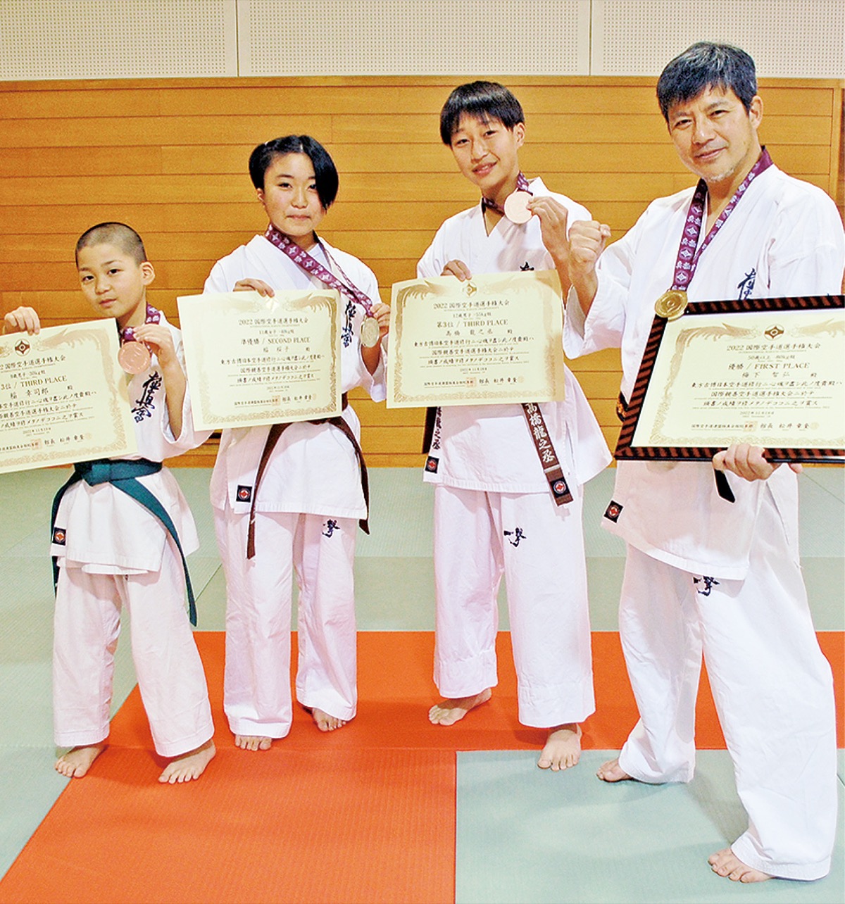 極真会館西湘支部の梅下智弘さん(初段・秦野市北矢名)と高橋龍之丞(平塚市)さん、稲桜子さんと幸司郎さん姉弟(平塚市)4人が11月19日に東京体育館で開催された2022国際空手道選手権大会で入賞を果たした。