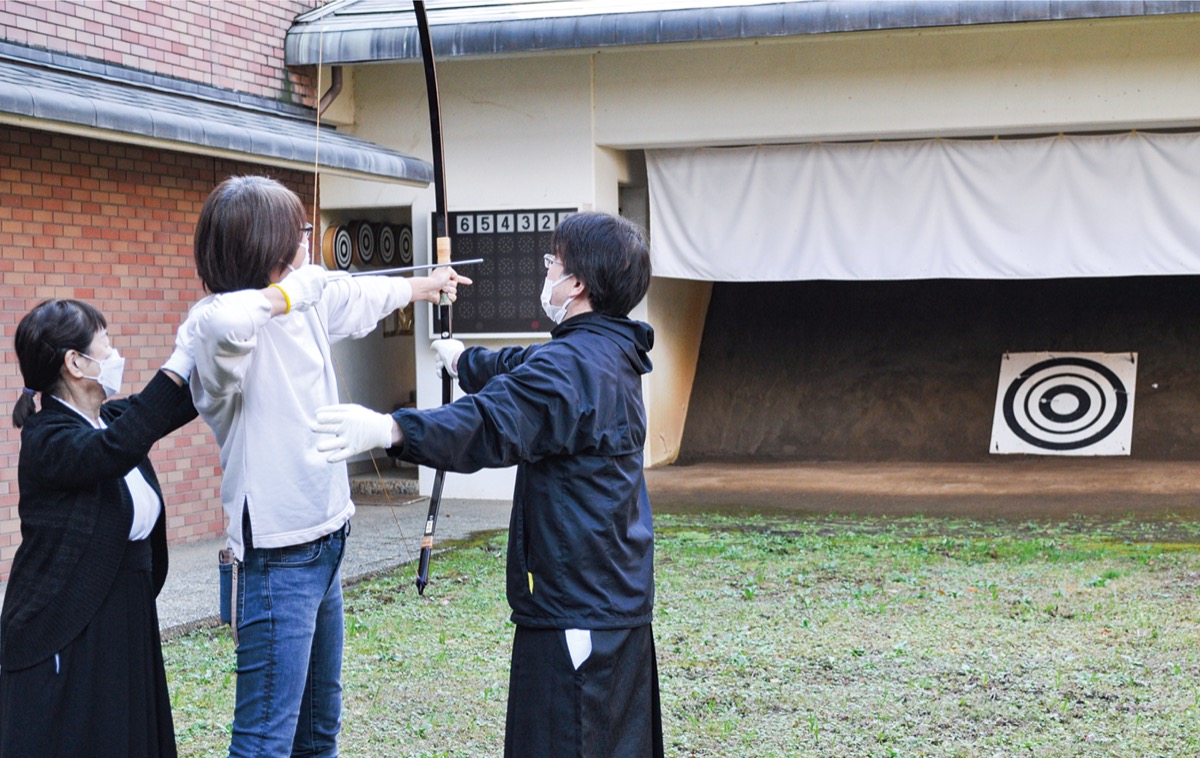 弓道の参加者は最初に弓の構え方や矢の打ち方の説明を受けてから実際に弓と矢を使って的に当てる体験をした。実際の競技では点数や順位をつけるが、この日は矢を的にあてる楽しさを実感してもらうために点数を競わずに的を狙った。また、直径1メートルで遠的に使用する的を使い、射的距離も正式な競技の半分の長さから狙いを定める。参加者が的に当てると歓声が上がるなど会場は盛り上がった。