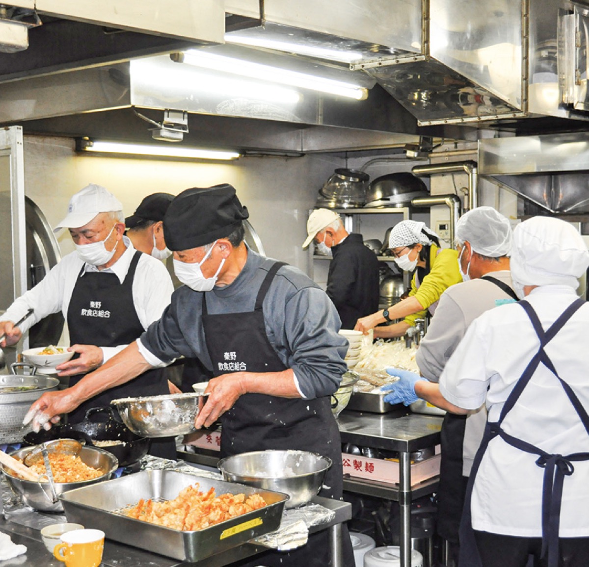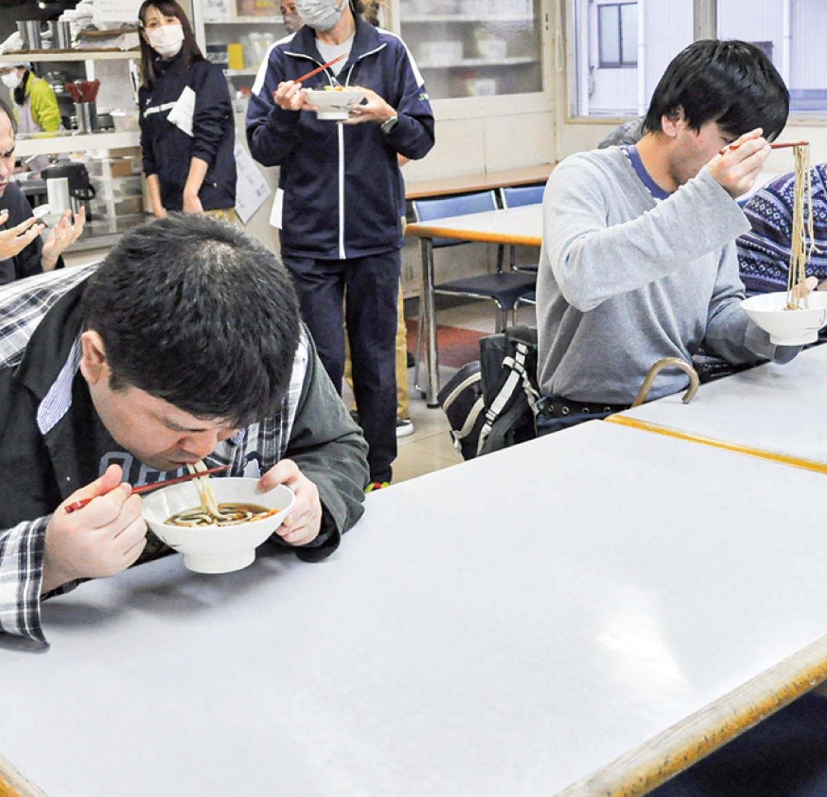 秦野市戸川の知的障害者支援施設「松下園」(社会福祉法人寿徳会)で12月1日、一足早い年越しそばが振舞われた。これは秦野飲食店組合(川口浩太組合長)が地域貢献事業として行っているもの。感染症拡大のため近年は代替事業を行っていたが、3年ぶりの開催となった。施設利用者らは、天ぷらそばと天ぷらうどんから好きな方を一つ選び、美味しそうに食べていた。