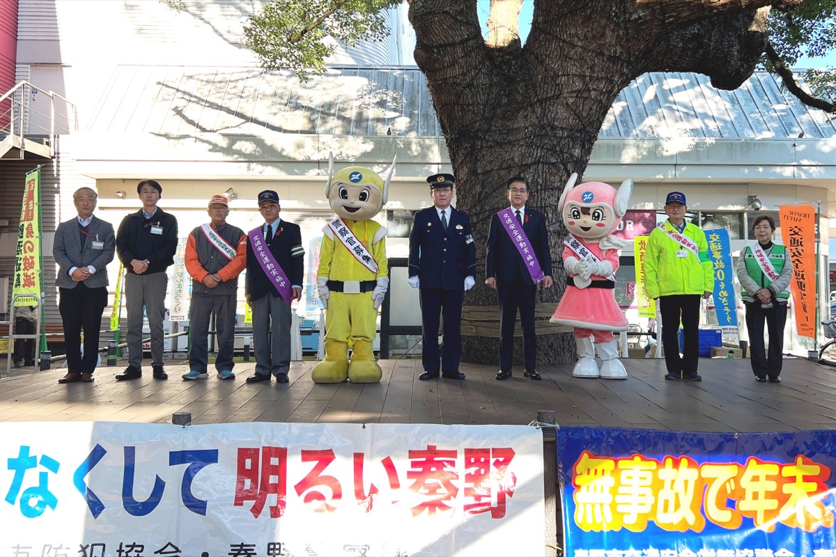 「年末交通事故防止運動」及び「年末年始特別警戒地域安全運動」が12月20日、イオン秦野ショッピングセンターくすの木広場で行われた。この日は秦野市交通安全対策協議会のほか、秦野警察署、秦野市、秦野市交通安全協会、秦野市安全運転管理者会、秦野市防犯協会など交通や防犯関係の団体・企業など約100人が参加した。