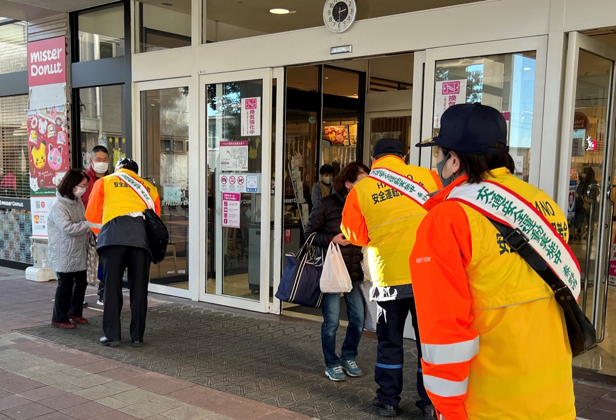 その後、参加者らは飲酒運転の根絶を呼びかける啓発品等を、イオンの買い物客などに配布。「交通事故や振り込め詐欺に気をつけてください」と呼びかける参加者に、買い物客らは「気を付けます、ありがとう」などと話し、啓発品を受け取っていた。