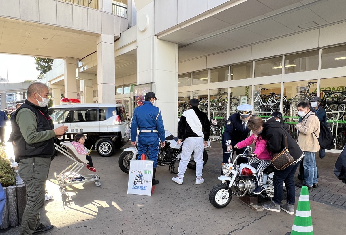 イオン敷地内では、この日にあわせてパトカーや白バイの撮影会、交通安全教育車による反応テストや運転シミュレーターなども行われ、親子で楽しむ姿も見受けられた。