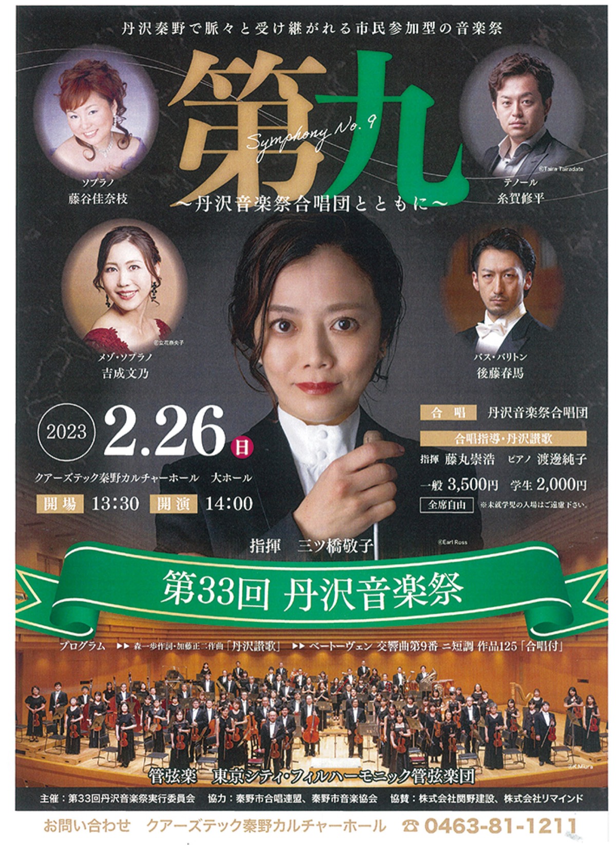 当日の指揮者には、2009年Newsweek Japan誌で「世界が尊敬する日本人100人」に選出され、2013年には第12回齋藤秀雄メモリアル基金賞を受賞した三ツ橋敬子さん、演奏には東京シティ・フィルハーモニック管弦楽団を迎える。合唱指導に藤丸崇浩さん、合唱ピアノは渡邊純子さんがつとめる。