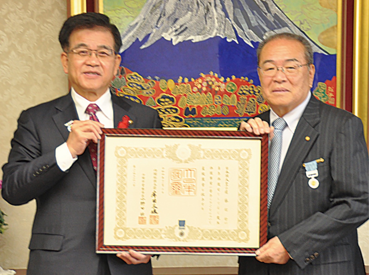 秦野保護司会で保護司として活動する寺山在住の遠藤信行さん(74)が藍綬褒章を受章し、12月6日に高橋昌和秦野市長を表敬訪問した。同褒章は、教育や福祉などの公益に尽くした人に贈られるもので、遠藤さんは「まさか自分が賞をもらえるとは思っていなかった。ありがたいこと」と話した。