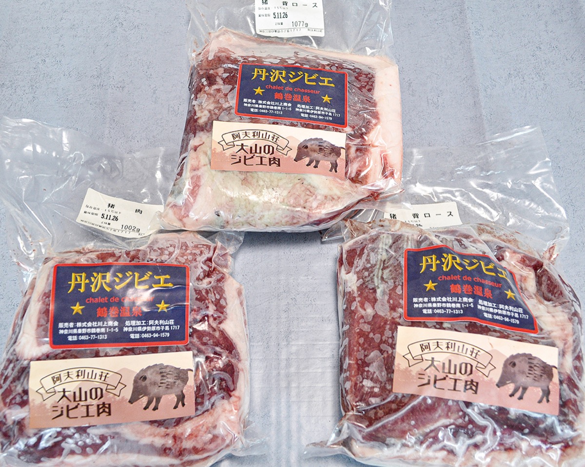 これを購入したのが、「ジビエの食べられる街鶴巻温泉」の取り組みを行う飲食店等に、同山荘から仕入れた肉を卸している川上商会。川上拓郎社長によるとイノシシからは40kgほどの食用肉が取れ、うち半分ほどを同社が購入したという。阿夫利山荘と川上商会は兼ねてより取引きがあり、「お互いに”噂のイノシシ”を売買するつもりでいた」と川上社長。