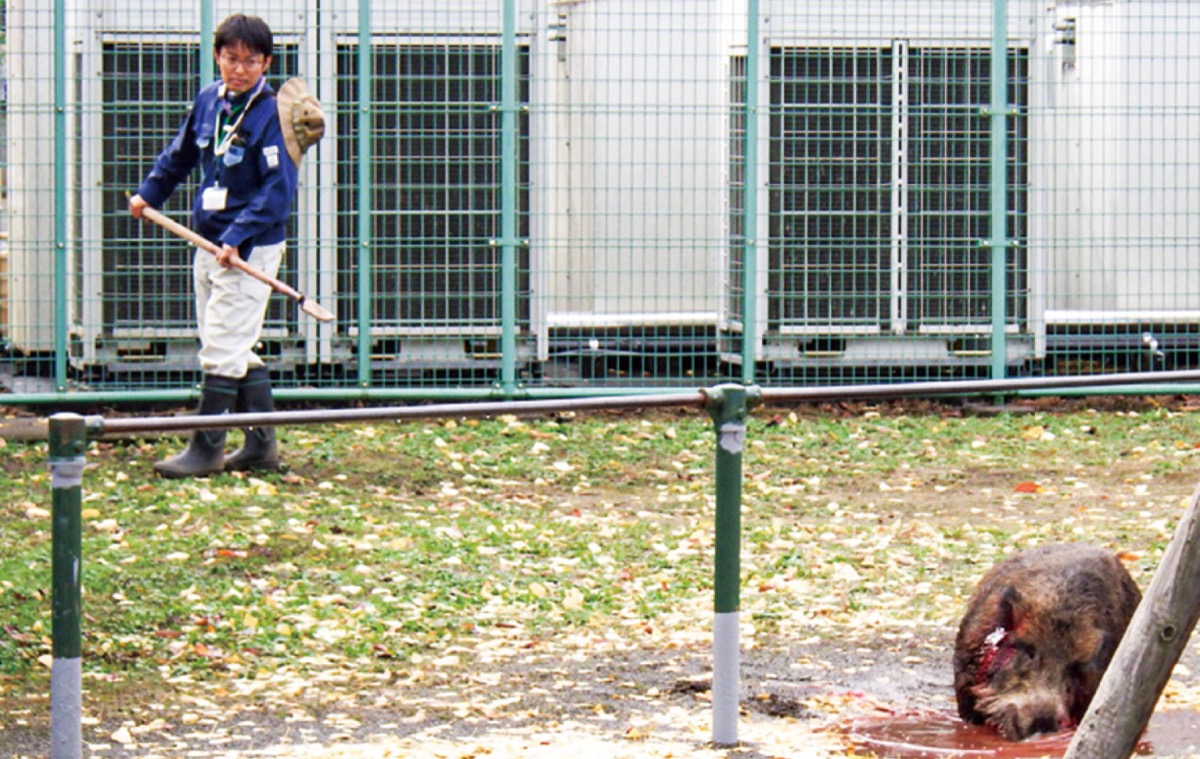 このイノシシは昨年11月24日、平和橋付近や桜土手古墳公園、本町中学校、イオン秦野ショッピングセンターなどで目撃され、はだの都市農業支援センター職員や警察官らに末広小で捕獲された。体重88・6kgの巨体は即日伊勢原市の阿夫利山荘に搬入され、血抜き処理などが行われた。