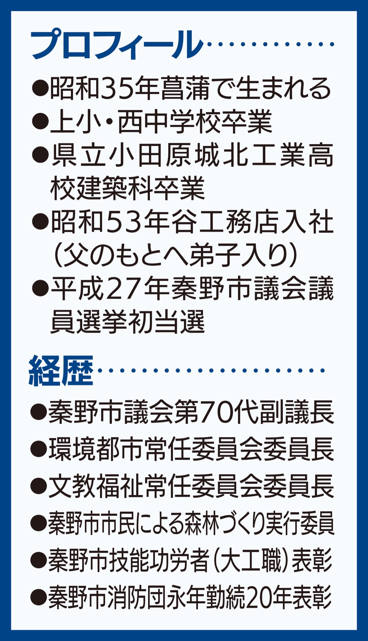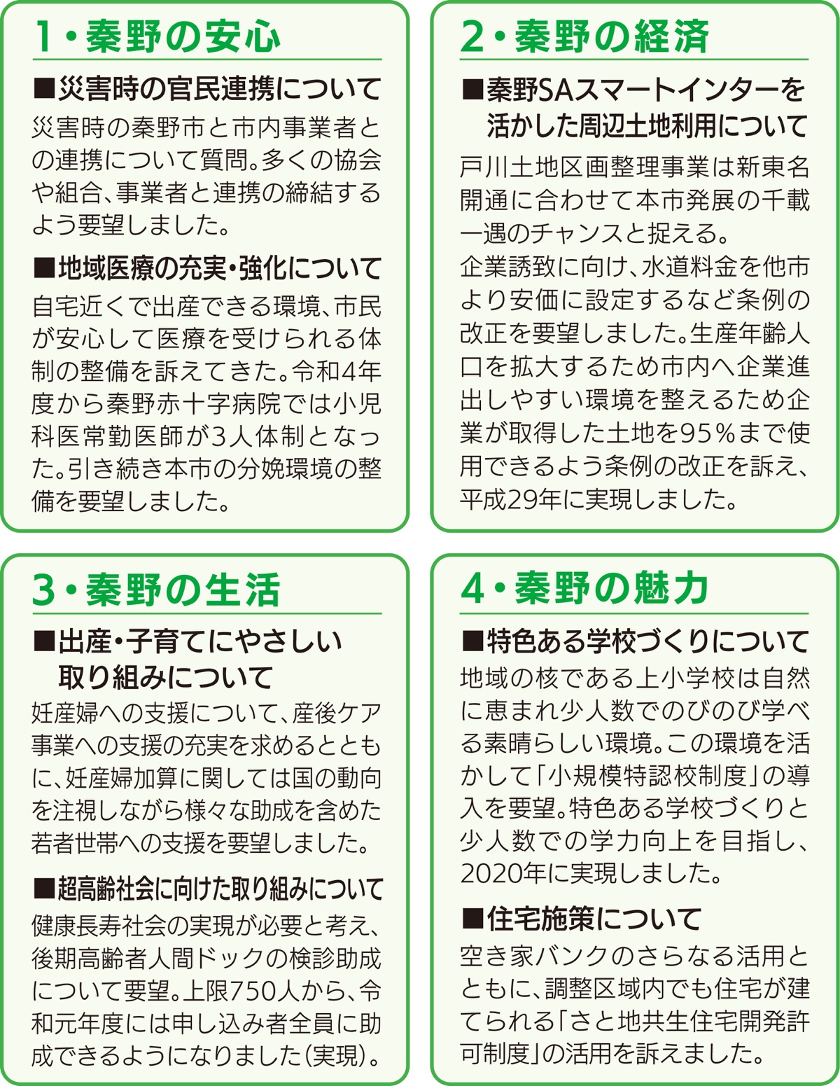 人口減少に直面する故郷秦野に対する危機感から、8年前に市議会議員選挙に挑戦し、政治の世界に飛び込みました。2期およそ7年間市議会議員を務め、最大会派の代表や副議長などを務めさせていただくなど貴重な経験を積むことができました。市議会議員として取り組んできた活動の一部を紹介いたします。