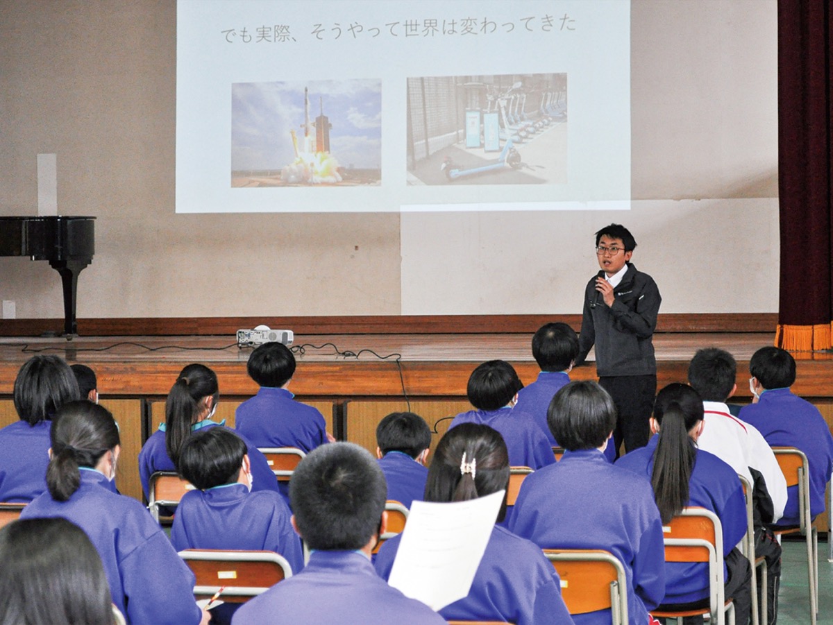 北中学校で2月8日、2年生を対象にしたドリームワイドプロジェクト第2弾「秦野から世界に羽ばたく未来クリエーター」と題した講演会を行った。講師には菩提に本社を構える企業「Zip Infrastructure(ジップインフラストラクチャー)」の須知(すち)高匡(たかまさ)代表取締役社長が招かれた。