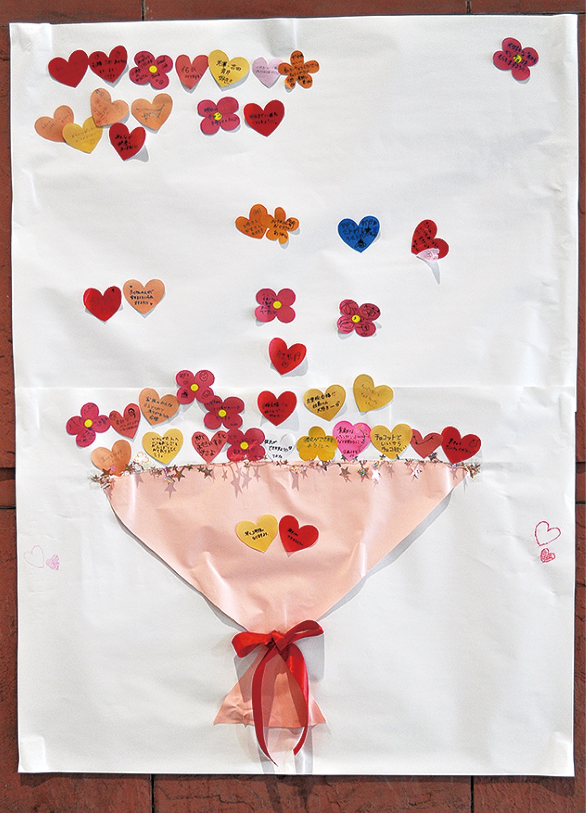 現在は、駅サービス係が主催の取り組み「バレンタインデー・ホワイトデー合同企画」を盛り上げるためのメッセージが書かれている。改札口入って左側の壁に花やハート型のカードにメッセージを書いて貼り花束を作ろうという企画で、3月末まで行われる。メッセージの中には願い事を書く人も。「通勤で駅を利用している方も、お時間のある時に書いてもらえればうれしい。一緒に楽しんでもらいたい」と天田さん。同様に、4月からは桜の木にメッセージを書いてもらう企画を予定している。