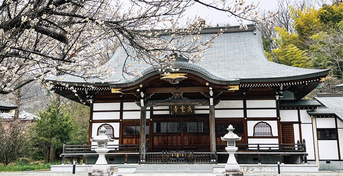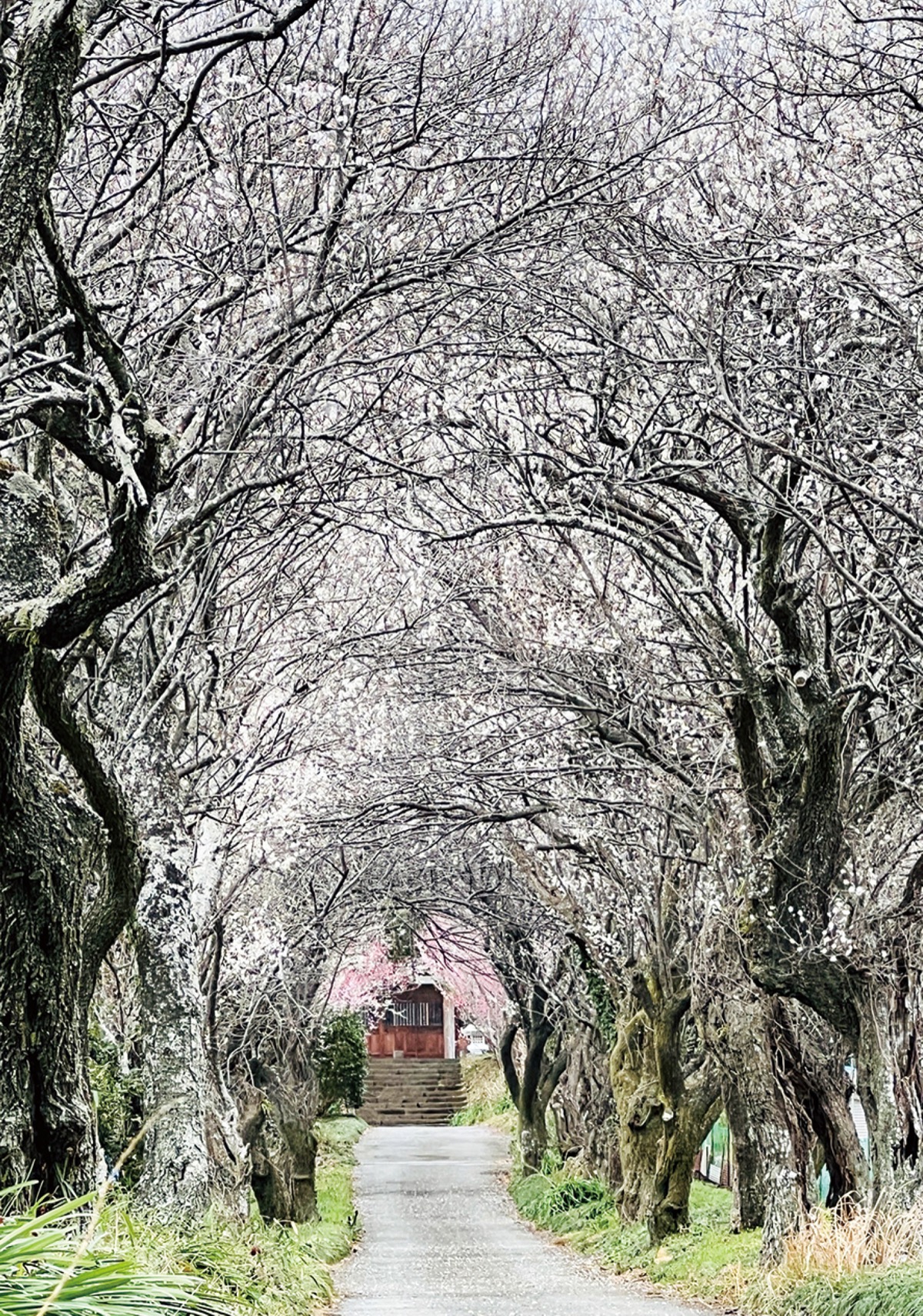 同寺は秦野市内でも梅の名所として知られる寺で、全長約200mの参道の脇に植えられた白梅が枝を伸ばし、満開時には白いトンネルのようになる。