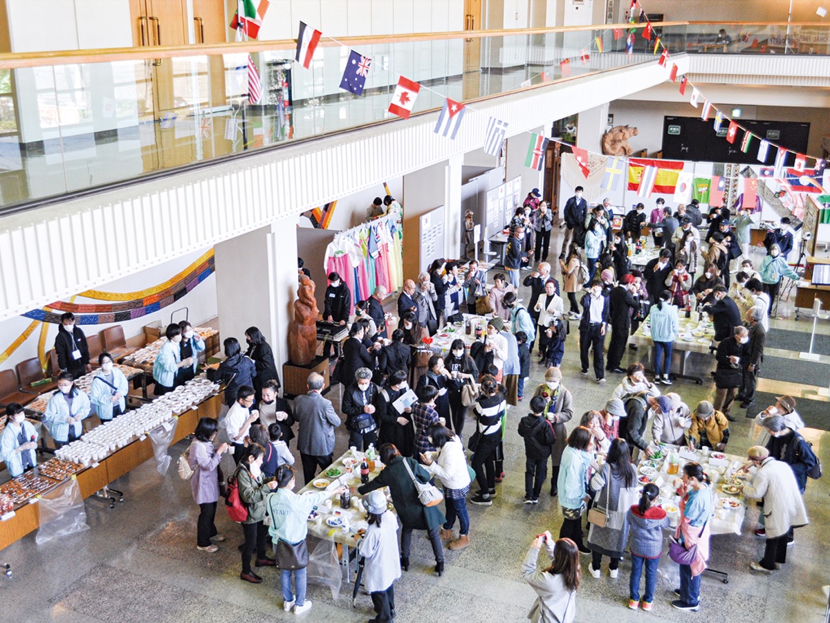 交流会には約210人が参加。日本文化の体験コーナーとして和服の着付け体験のほか、韓国、スペイン、ラオス、ベトナムの紹介ブースが出展し、ホワイエ中央には軽食スペースが設けられた。外国のお菓子のほか、唐揚げやいなりずしなど日本の食べ物が用意され、参加者らは味の感想などを話しながら、和やかに交流していた。