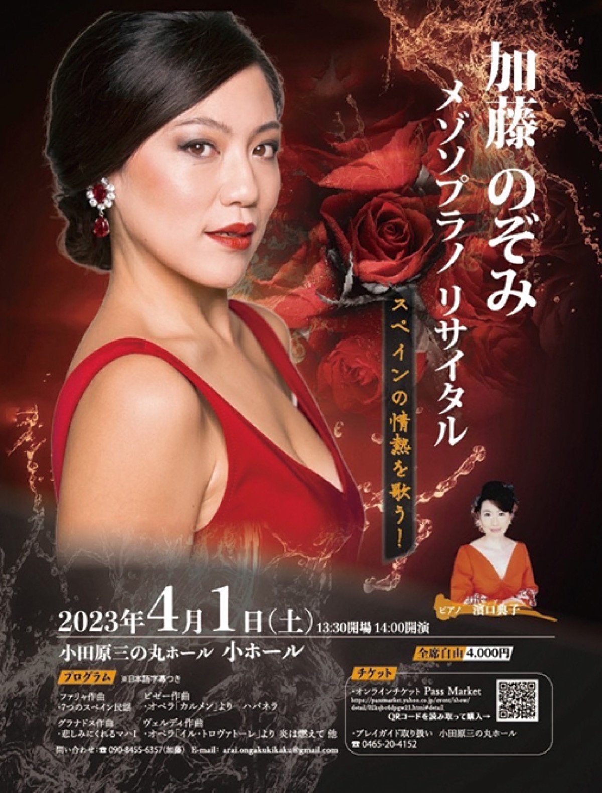 秦野市出身のメゾソプラノ歌手・加藤のぞみさんによる「加藤のぞみメゾソプラノリサイタル〜スペインの情熱を歌う!」が4月1日(土)、小田原三の丸ホール小ホールで開催される=写真。