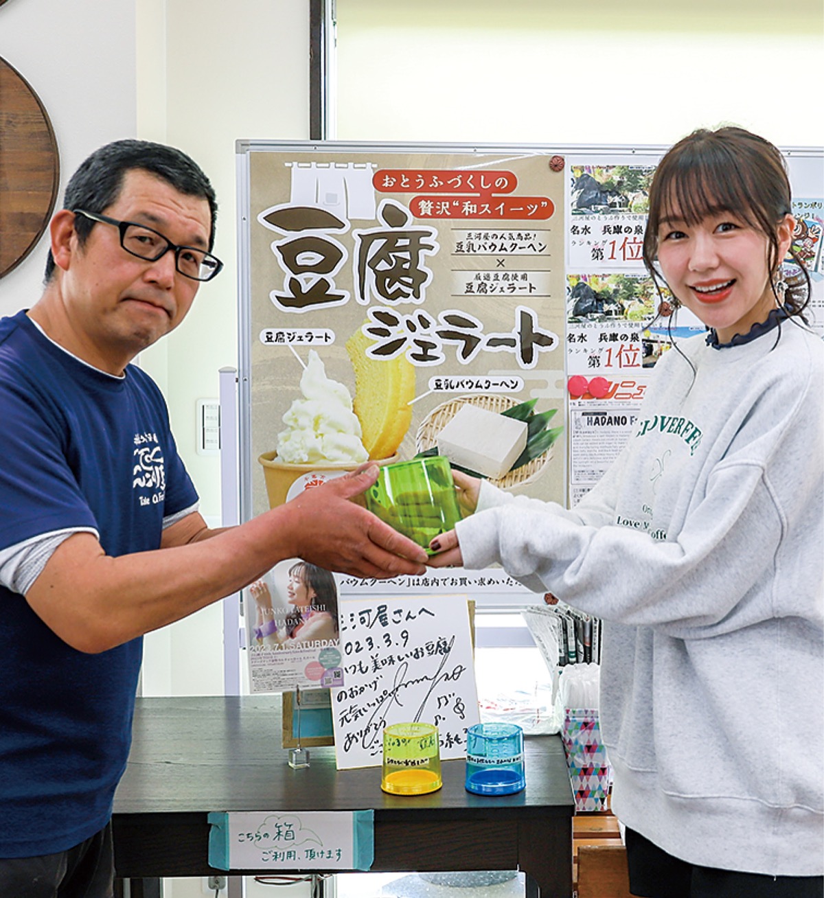 秦野市出身のシンガーソングライターで、はだのブランドアンバサダーを務める立石純子さんが3月10日、秦野市内の飲食店や小売店などおよそ15店舗を訪ね、チャリティーボックス設置の協力を呼びかけた。立石さんは、世界の子どもたちにきれいな水を届ける取り組みを行うウオーターエイドジャパンへ贈るための青いボックス、広葉樹の苗木を秦野ガス・ネイチャーパークくずはへ贈る緑のボックス、子どもたちのために市内の保育園に楽器を贈るための黄色いボックスの3種類を用意。依頼を受けた店舗のひとつで市内の豆腐店「杜のとうふ工房三河屋」の諸星卓代表は、「是非応援したい。協力します」と立石さんが持参した3つのボックスを早速店内に設置した。