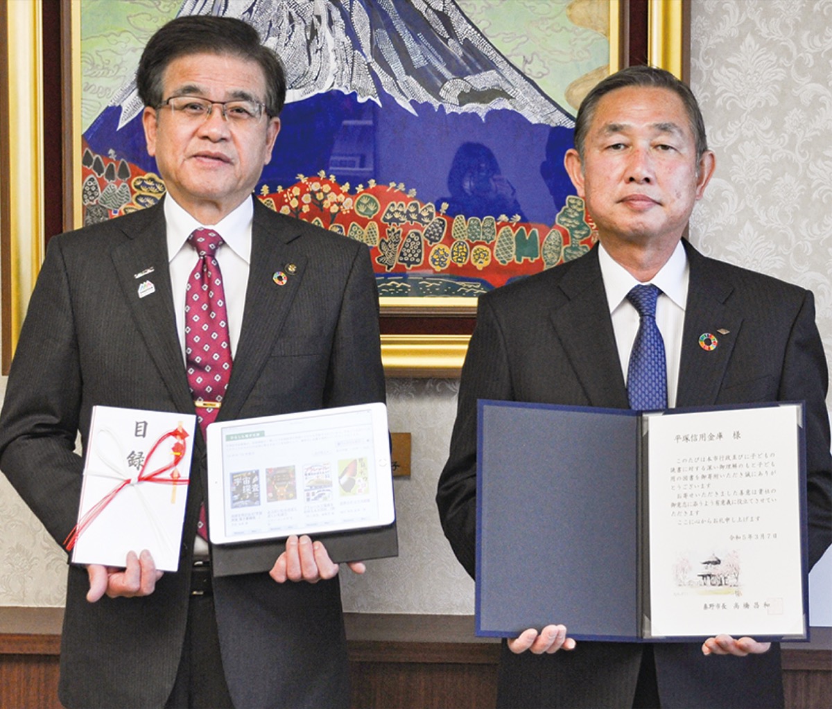 平塚信用金庫が秦野市に子ども向けの電子書籍19冊を寄付した。3月7日には同金庫の曽我和雄専務理事らが市庁舎を訪れ、贈呈式を行った。