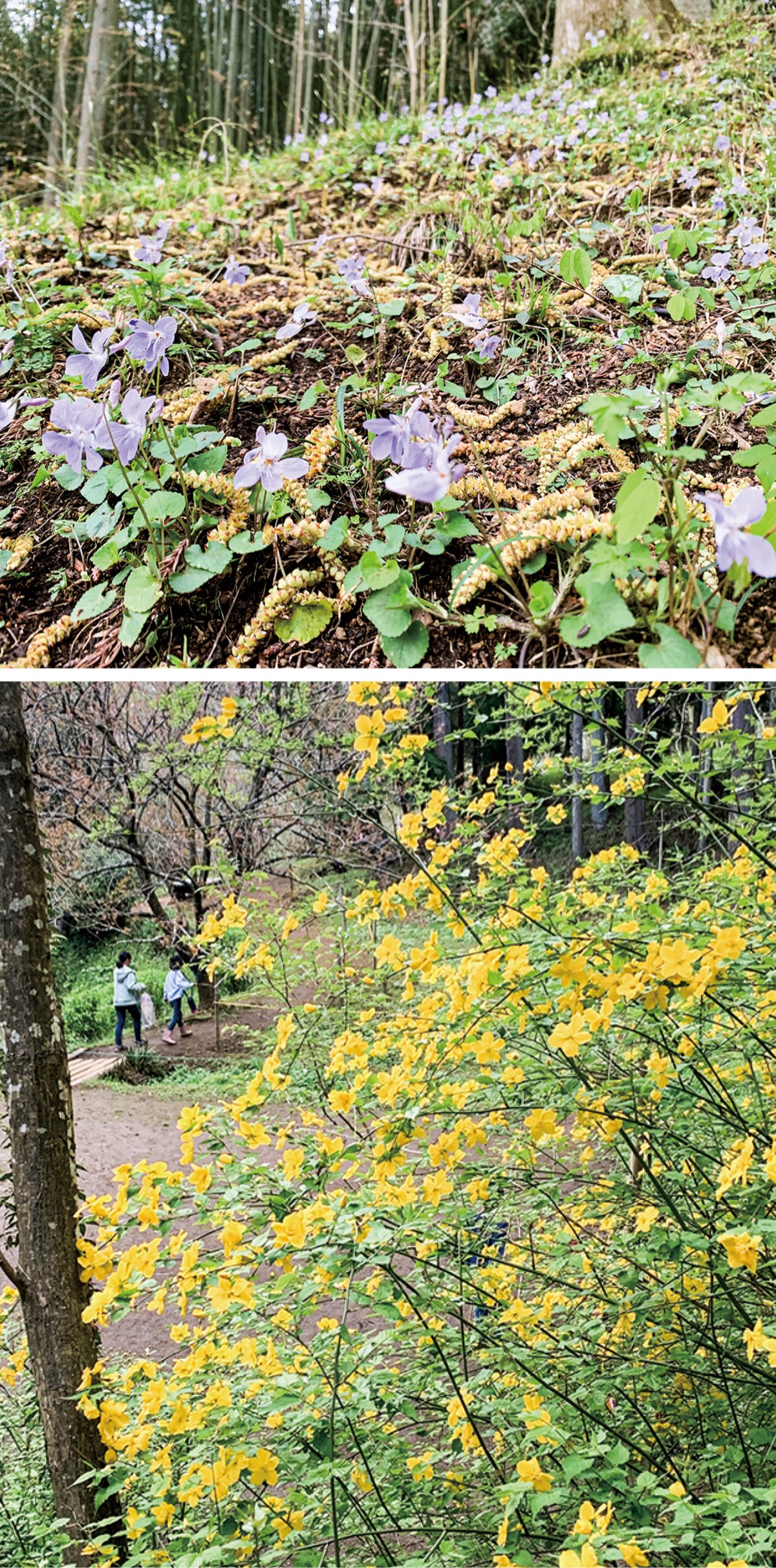 広場には小川や池が整備され、生き物が観察できるほか、桜やレンゲ、ツツジなど季節を感じる花が開花する。今の時期は斜面に群生しているスミレや、小野さんが植栽したヤマブキが、薄紫と黄色の見事なコントラストを描いている。この後は、ショウブとキショウブが開花時期を迎えるという。