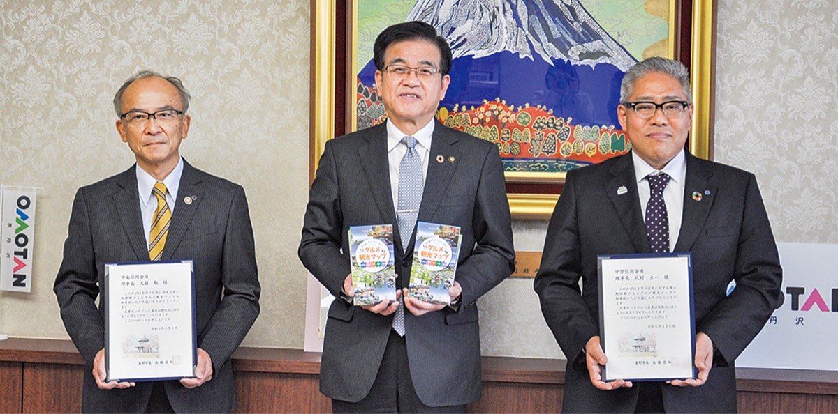 中栄信用金庫(本店/秦野市・北村圭一理事長)と中南信用金庫(本店/大磯町・大藤勉理事長)が4月6日、グルメ観光マップ5000部を秦野市に寄贈した。