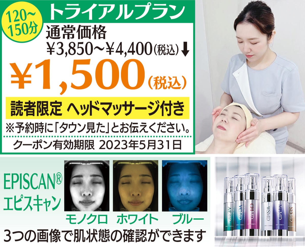 「マスク着用が緩和され、口元の肌を気にされるミセスが増えてきました」。そう話すのはフェイシャルサロン「シーボン.伊勢原店」だ。同店では専門スタッフがシミ・シワ・たるみなど個人の肌悩みに合わせてフェイシャルケアを行い、自宅でのスキンケアを提案してくれる(化粧品サンプル付)。今なら「肌解析」と「東洋式フェイシャルケア」を体験できる1500円(税込)のトライアルプランに、読者はヘッドマッサージの特典付き!この機会をお見逃しなく。