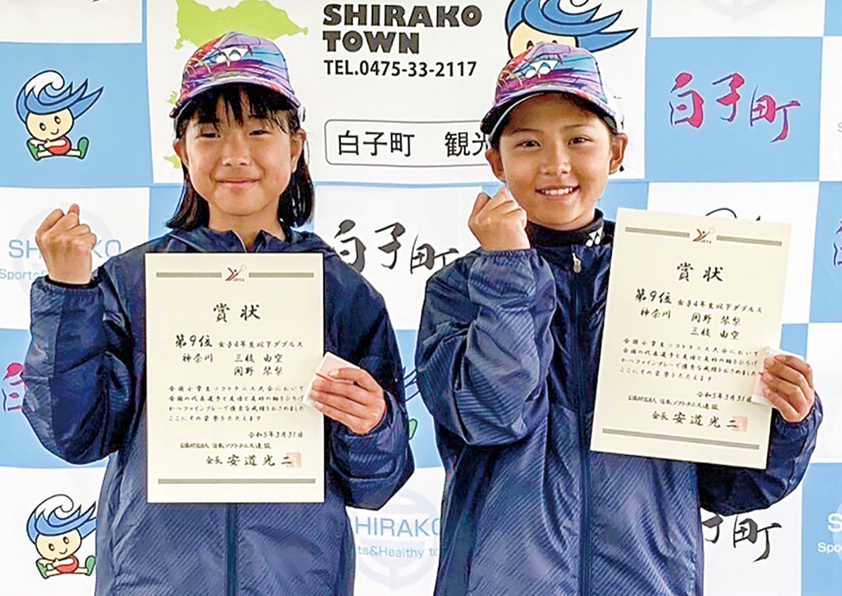 丹沢ジュニアソフトテニスクラブの関野琴梨(ことり)さんと綾瀬チャレンジジュニアソフトテニスクラブの三枝由空(ゆら)さんペア(共に小5)が3月30日・31日に千葉県白子町で開催された「第22回全国小学生ソフトテニス大会」のダブルス男子・女子4年生以下の部でベスト16入りし、9位入賞した。