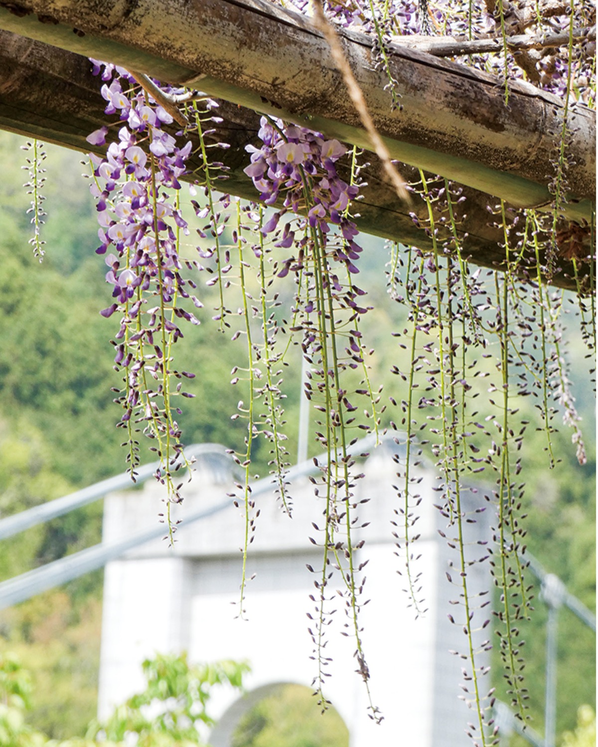 満開を迎えると、丹沢の山々や風の吊り橋をバックに、カーテンのように一面に垂れ下がる薄紫色の花を見ることができる。