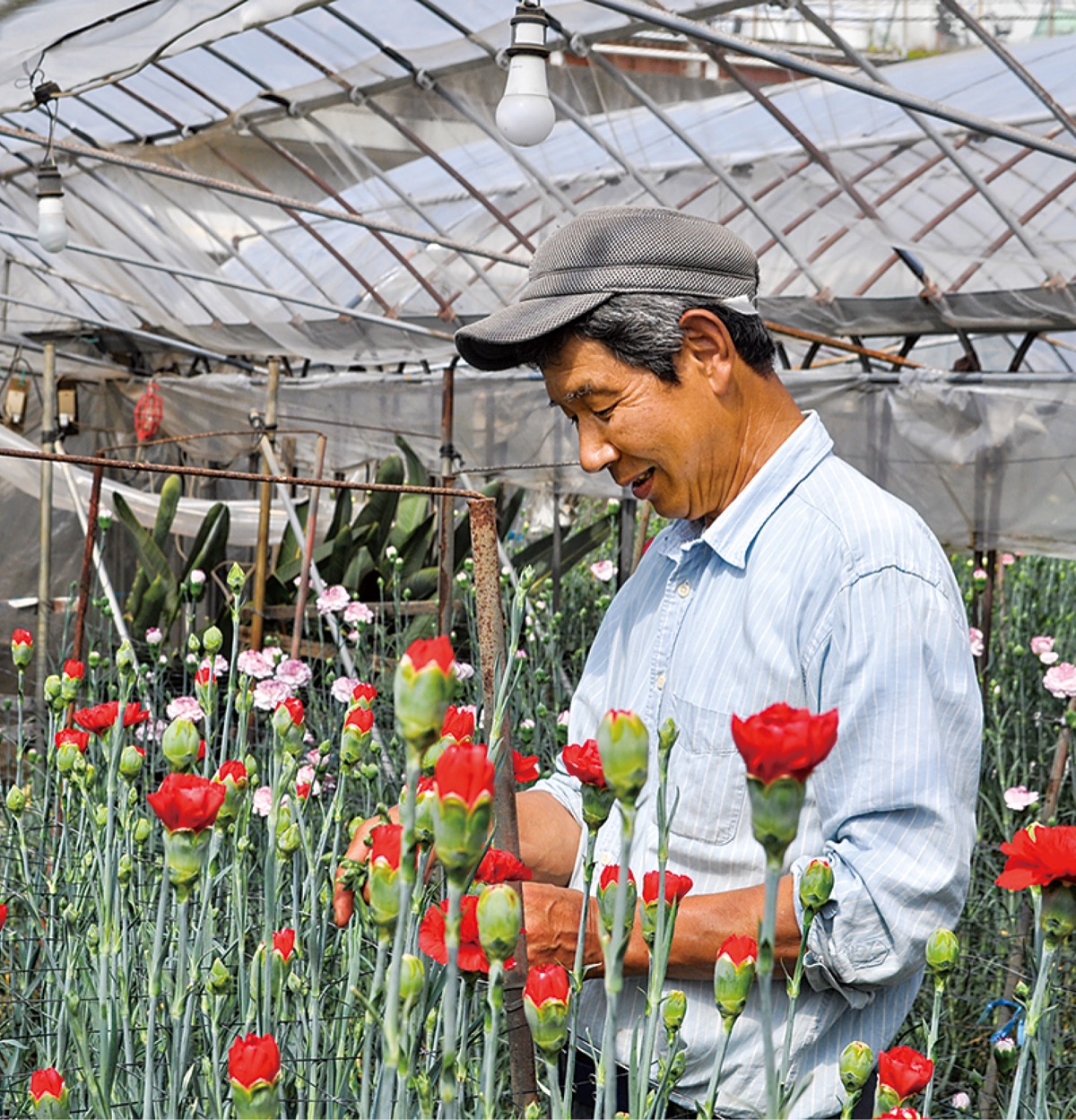 JAはだの花き部会カーネーション部の部長を務める櫛田雅洋さんは、落合にある「櫛田農園」の2代目。現在、ビニールハウスで赤やピンク、黄色、グリーン等、色とりどりのカーネーションやスプレーカーネーションを7種類育てている。現在は、一日500〜600本収穫しているが、最盛期になると一日1000本収穫するという。