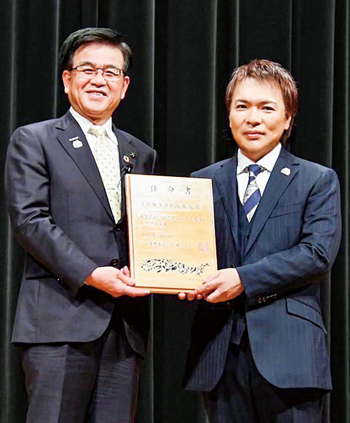 人気ロックバンド「LUNA SEA」のドラマーで、秦野市出身の真矢氏が5月6日、「はだのふるさと大使」に就任した。任命書授与式はクアーズテック秦野カルチャーホール大ホールで行われた「サタデーフェスティバル」の中で実施。真矢氏が会場に登場すると、名前を叫ぶ観客など、喜びの声が上がった。高橋昌和市長から任命書を受け取とった真矢氏は「LUNA SEAの活動とともに、秦野の魅力がたくさんあることを皆さんに知っていただきたい」と挨拶。軽妙なトークで場を盛り上げた。