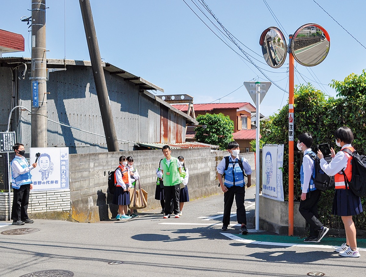 秦野市立本町中学校(山田浩之校長)は今年度、「デジタル通学路マップ作成活用プロジェクト」を推進している。5月16日には、生徒らが通学路の危険箇所を確認するフィールドワークを行った。
