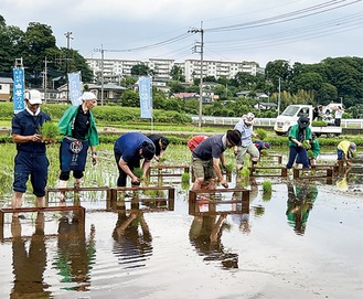 6月19日には蔵人や地域住民など約10人が参加し、田んぼに手作業で酒米を植えていった。酒米は秋の収穫イベントを経て、新ブランドの日本酒として来年販売予定。