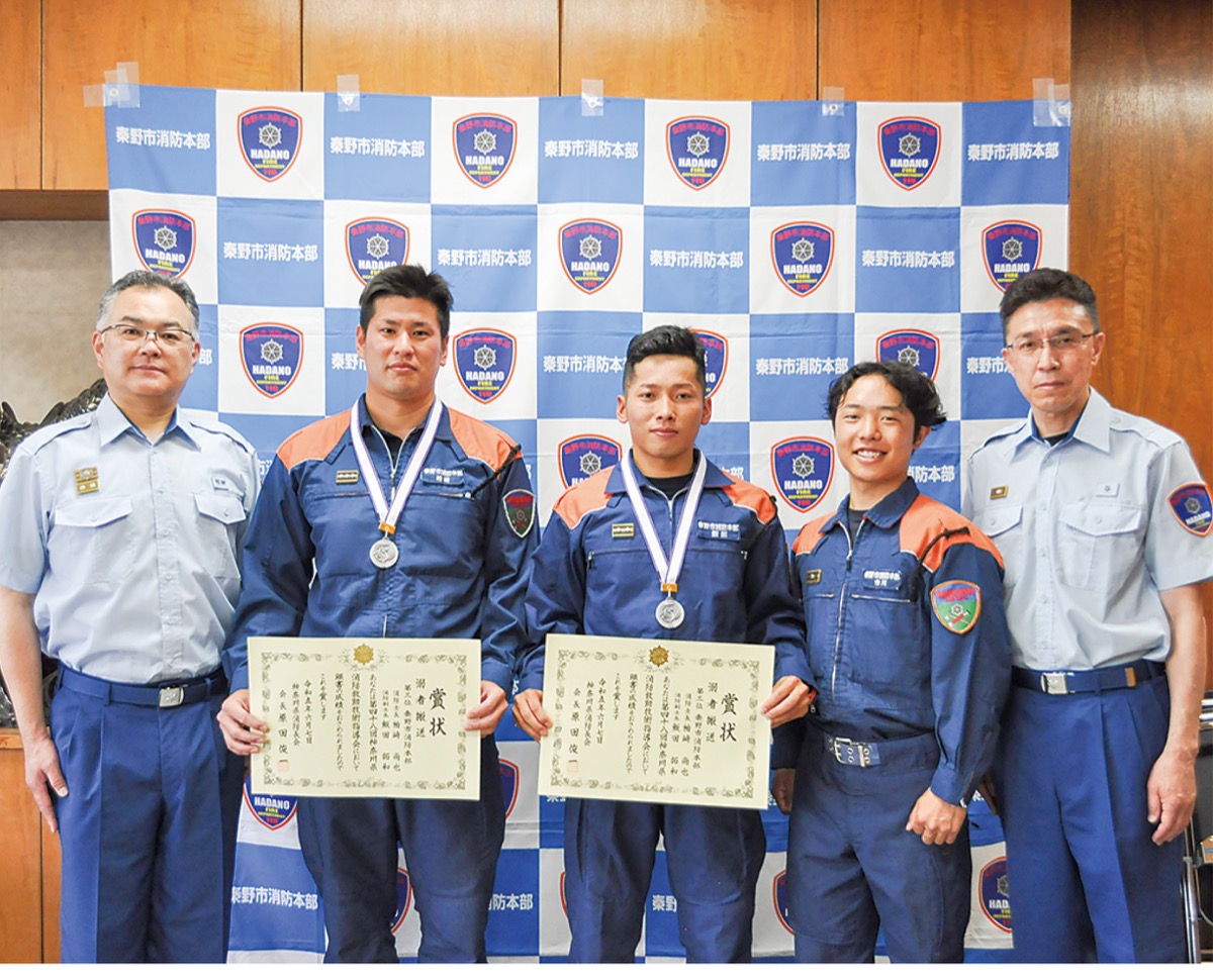 秦野市消防本部の消防長室で6月13日、第48回神奈川県消防救助技術指導会で入賞した3人の消防職員の伝達式が行われた。