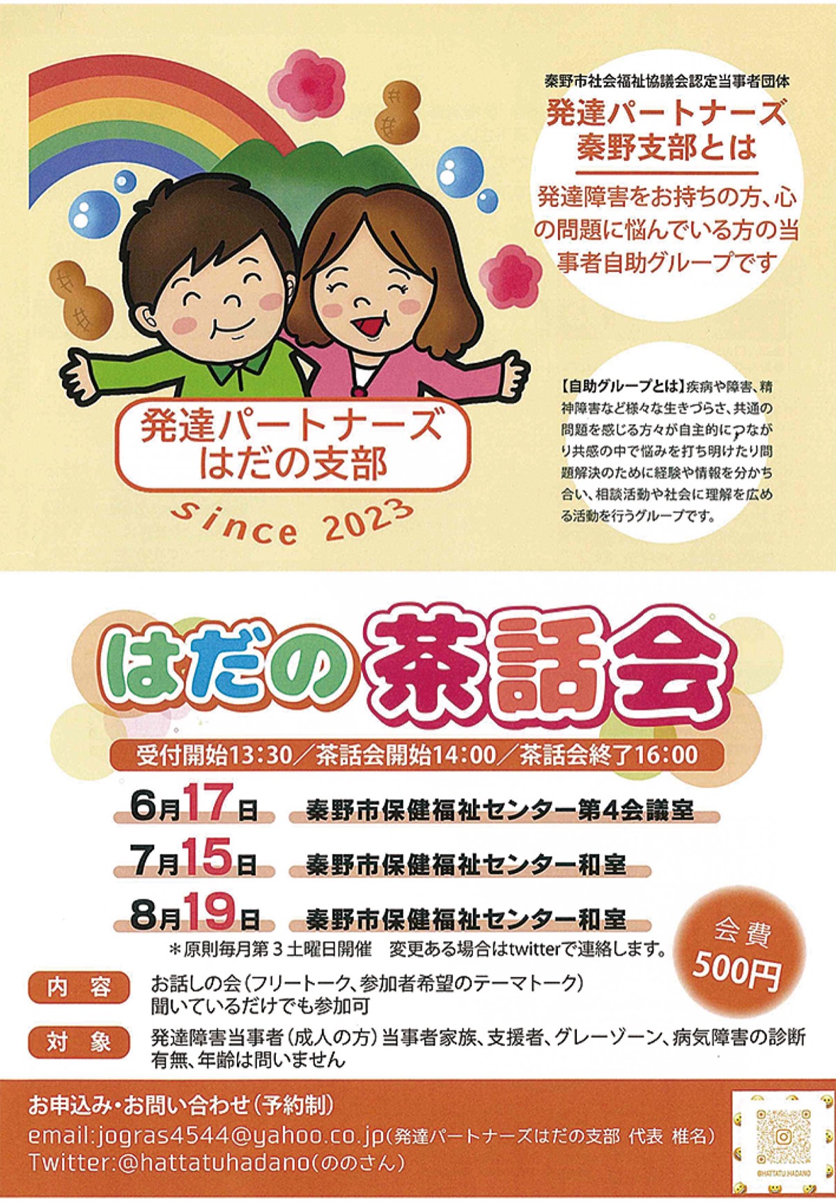 発達パートナーズはだの支部による茶話会が7月15日(土)、秦野市保健福祉センター(緑町16の3)和室で開催される。会費は500円。