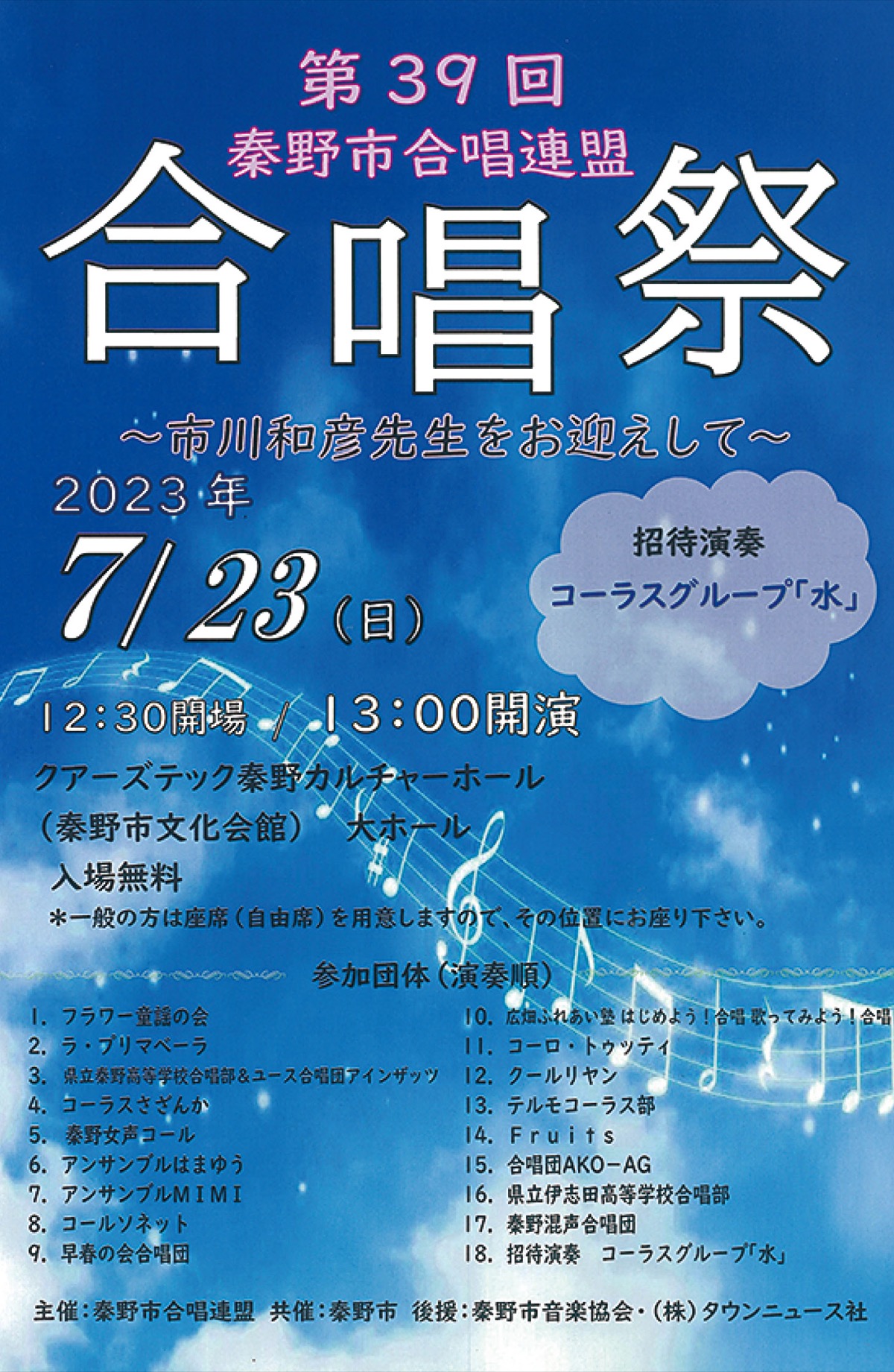 7月23日(日)、クアーズテック秦野カルチャーホール大ホールで秦野市合唱連盟が「第39回合唱祭〜市川和彦先生をお迎えして〜」を開催する。午後1時開演(12時30分開場)。入場無料。