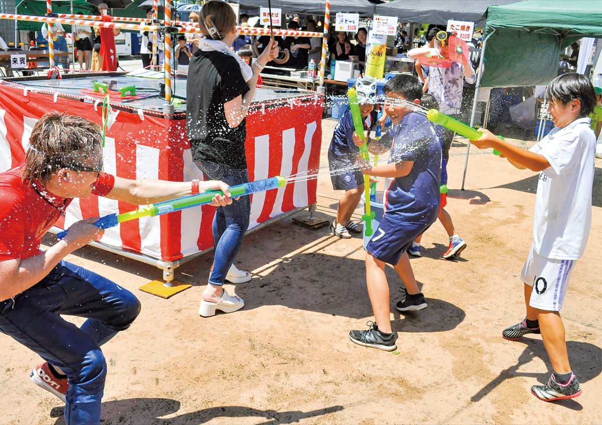 開会式後に行われた「ウォーターバトル」では、鬼役を務めるスタッフと子どもたちが、涼感たっぷりの水鉄砲バトルで盛り上がった。夜の部では、鶴巻若衆囃子の演奏や、恒例の盆踊りも実施。猛暑の中でも1日通し大勢の来場者が訪れ、駅前エリアは賑わった。