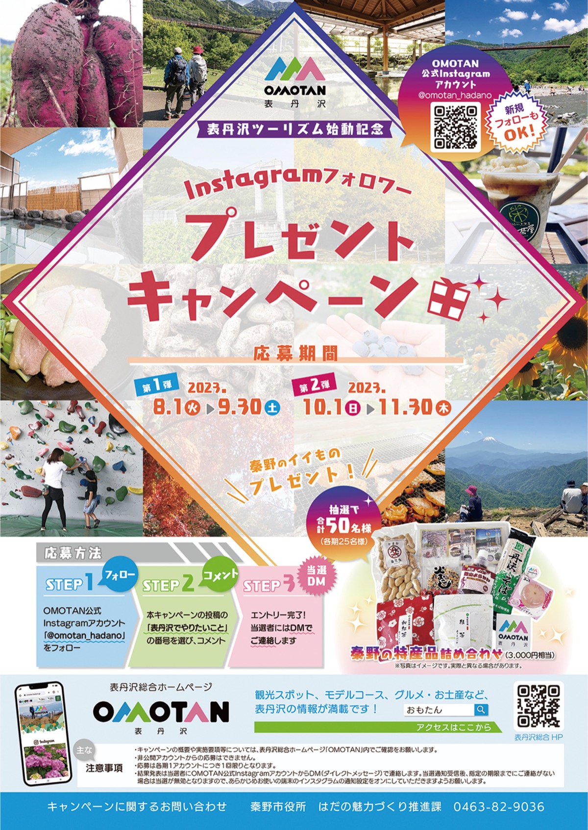 OMOTAN公式インスタグラムアカウント(@omotan_hadano)をフォローし、キャンペーンの案内投稿のコメント欄に「表丹沢でやりたいこと」の番号を入力すればエントリー完了。募集期間は、第1弾が8月1日から9月30日(土)まで、第2弾は10月1日(日)から11月30日(木)まで。応募は各期につき1アカウント1回限りとなる。当選者には秦野の特産品詰め合わせ(各期25人合計50人)がプレゼントされる。