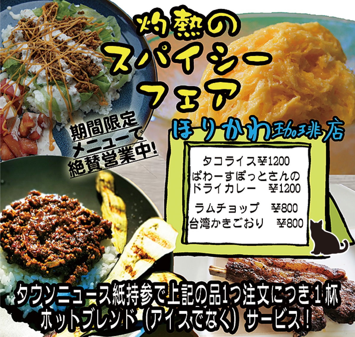 ほりかわ珈琲店では現在、期間限定メニューで営業中。9月初旬頃まで「灼熱のスパイシーフェア」を開催する。この時期イチオシは「スペシャルティの豆で抽出した奇跡の水出アイスコーヒー」。現在、店内はオールセルフでお一人様も気軽に利用できるスタイル。タウンニュース持参で写真の4品を注文ごとに、ブレンドコーヒー(500円)サービス。