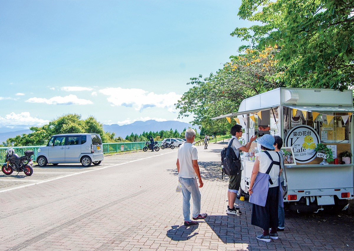 秦野市の展望スポット「菜の花台」(羽根1079の5)は、眼下に秦野の街や相模湾、富士山などが一望できる観光客らに人気の場所だ。しかし、同所では飲食物などの物品販売が禁止されているほか、自動販売機の設置もない。この状況を受け市は、同所を管理する神奈川県と調整し9月18日(祝)まで、初となるキッチンカーによる飲食販売の実証実験に取り組んでいる=写真。