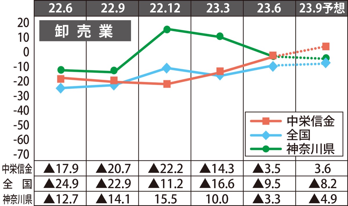 業況判断D.I.は前回調査比10・8ポイント改善の▲3・5となった。食品卸売業では、主要取引先の業況回復で受注量が増加し景況感の改善となった。一方、建材卸売業では省エネ住宅改修工事に係る補助金制度の開始に伴い、住宅関連資材に係る受注量の増加がみられたが、同業他社との仕入競争及び建築資材高騰の影響により収益性の悪化に繋がった。来期予想は7・1ポイント改善の3・6。