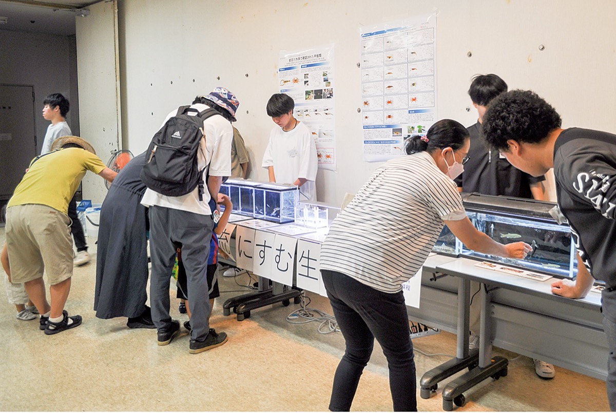 親子連れに人気だったのは、東海大学の協力による「ドクターアキヤマの名水科学実験SHOW&LABO」や「名水水族館」。科学実験LABOではスライムづくりや不思議な音が鳴る装置などの実験が楽しめ、子どもたちは科学の不思議に目を輝かせた。名水水族館では、里山に住む生き物の展示や実際に魚などに触れられるコーナーもあり「ヌルっとしてる」などと感想を話した。