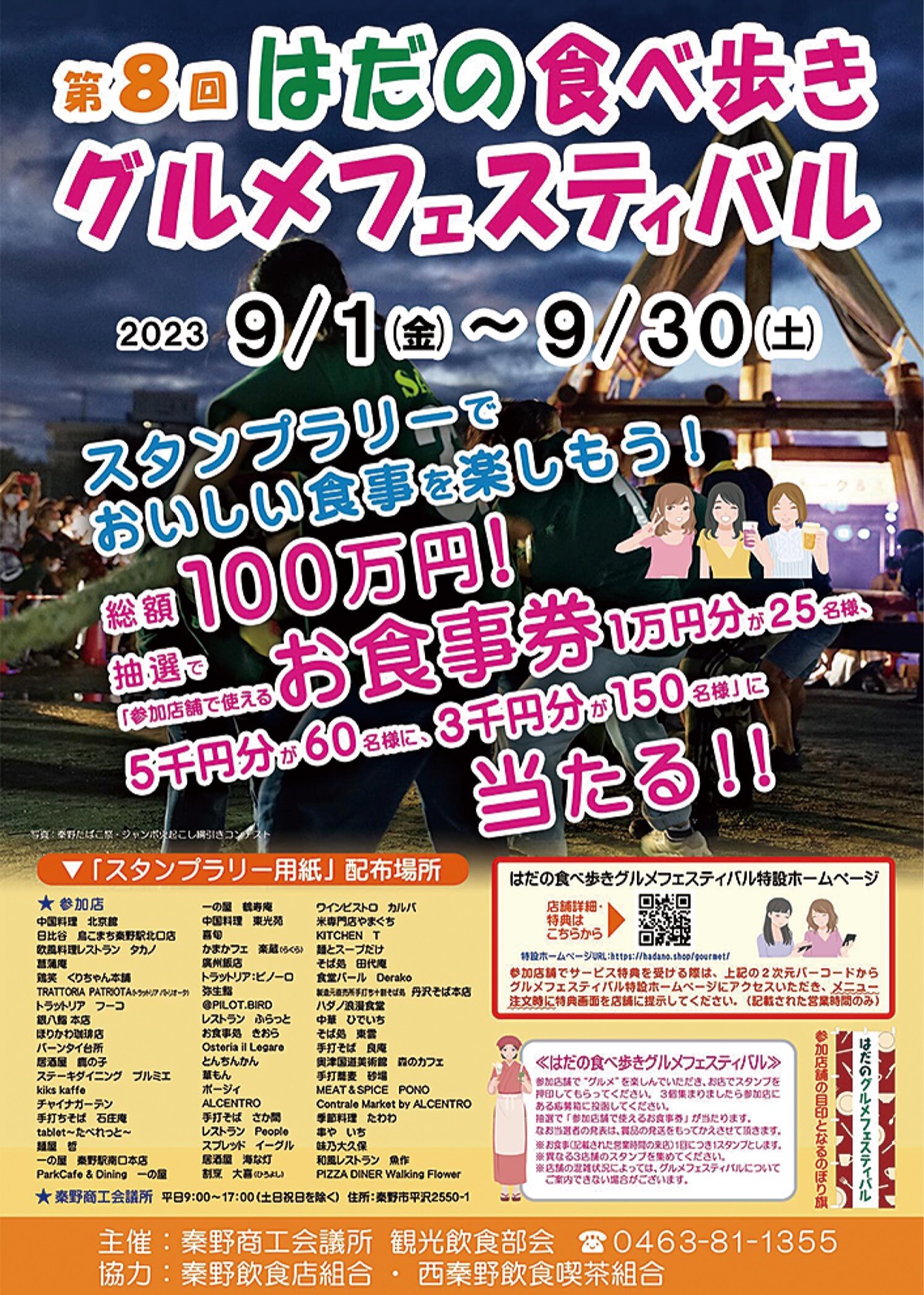 期間中、参加店舗での食事の際、スマホで特設ホームページにアクセスし提示すると店舗独自の特典が受けられる。また、参加店舗で食事をした際に押してもらえるスタンプを、3店舗分(同一店舗で複数のスタンプは不可)集めて応募するスタンプラリーも実施。抽選で参加店舗で使える食事券1万円分(25人)、5千円分(60人)、3千円分(150人)など、総額100万円が当たる。スタンプラリー用紙は参加店舗のほか、秦野市内の小田急線4駅、各公民館、秦野商工会議所、クアーズテック秦野カルチャーホール(市文化会館)、メタックス体育館はだの(市総合体育館)などに置かれている。