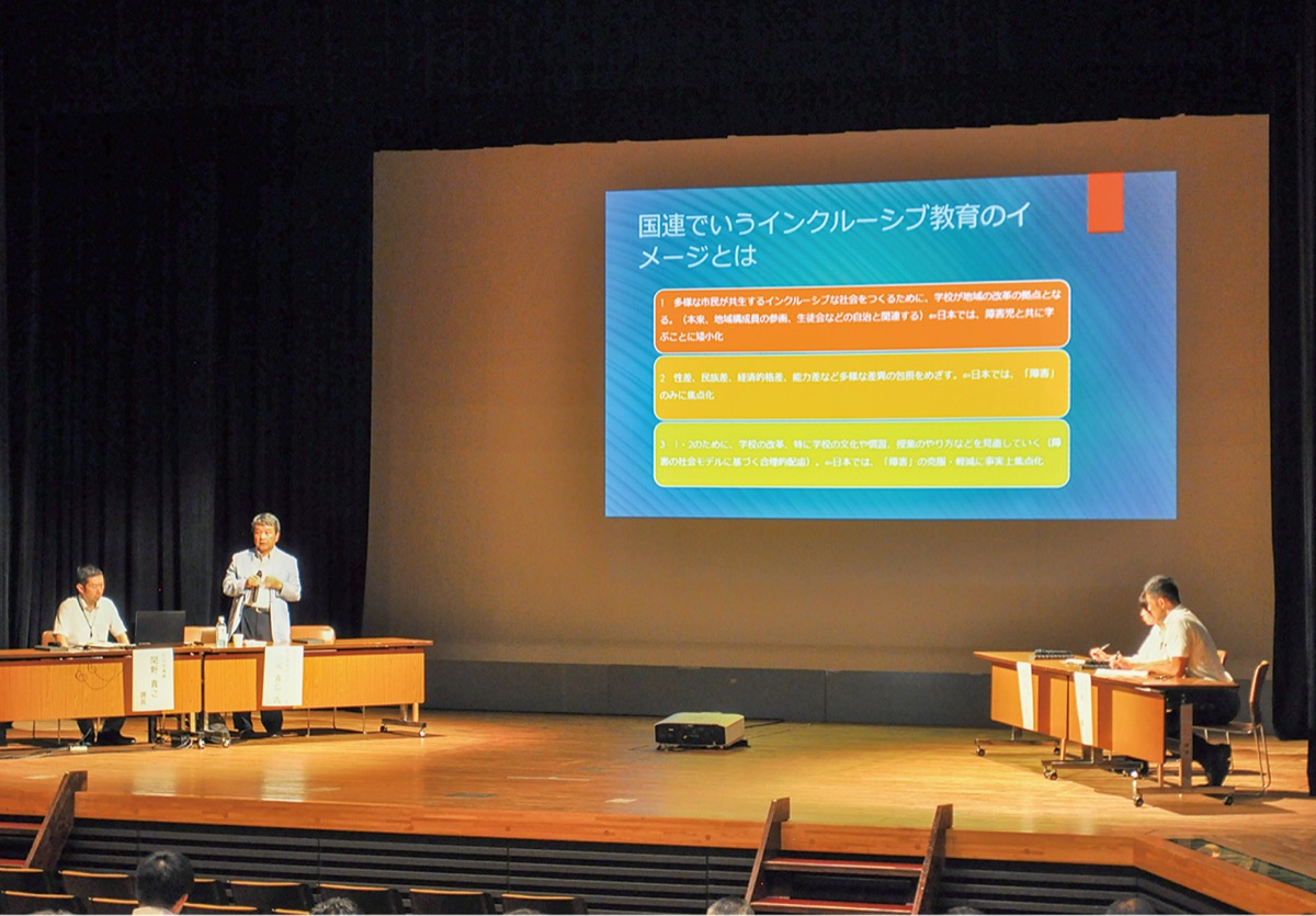 当日は第1部から3部まで、それぞれテーマを掲げてパネルディスカッションを実施。第1部では、メインパネリストとして東京大学バリアフリー教育開発研究センター長の小国(こくに)喜弘氏を招き、「誰もが輝く暮らし良い街のフルインクルーシブ教育」のテーマで議論が展開された。障害のある児童生徒との接し方について、小国氏は海外の事例を紹介しながら説明。聴講者からは「海外に特別支援学級はあるか」「学級の中でできる具体的な支援は」という質問も投げかけられた。