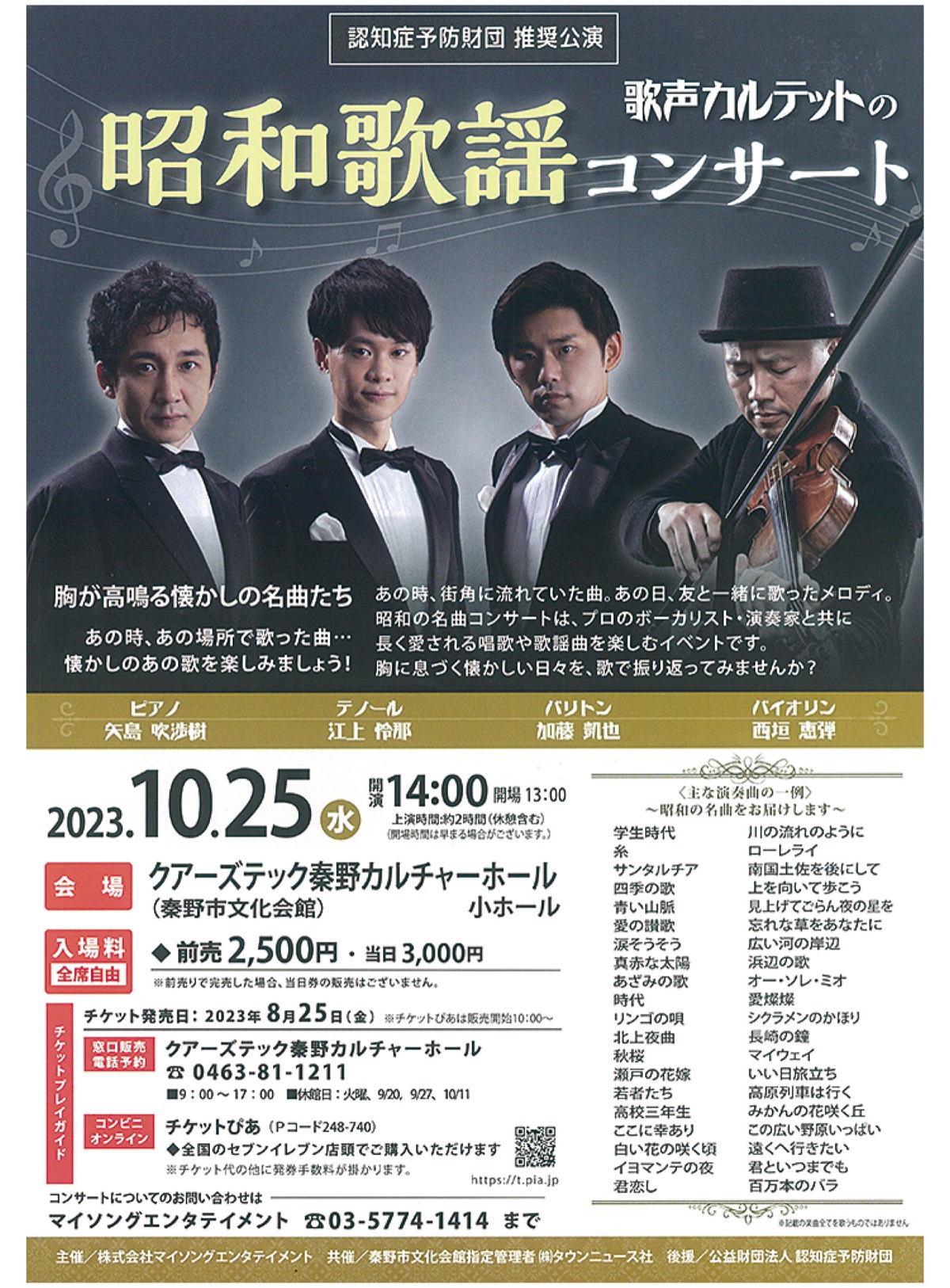 歌声カルテットはクラシック歌手とピアノ・バイオリン奏者で構成される実力派グループ。午後2時開演。チケットは全席自由2500円(当日券3000円)。同ホール窓口(【電話】0463・81・1211)で発売中(午前9時〜午後5時。火曜休館)。チケットぴあ(P コード248-740)でも購入可。