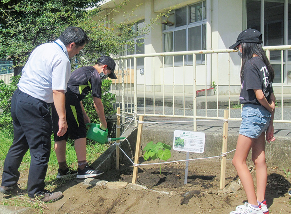 西小学校(小嶌恵校長)の5年1組が8月31日、平和学習を行い「被爆アオギリ二世」の苗木を校庭に植樹した。