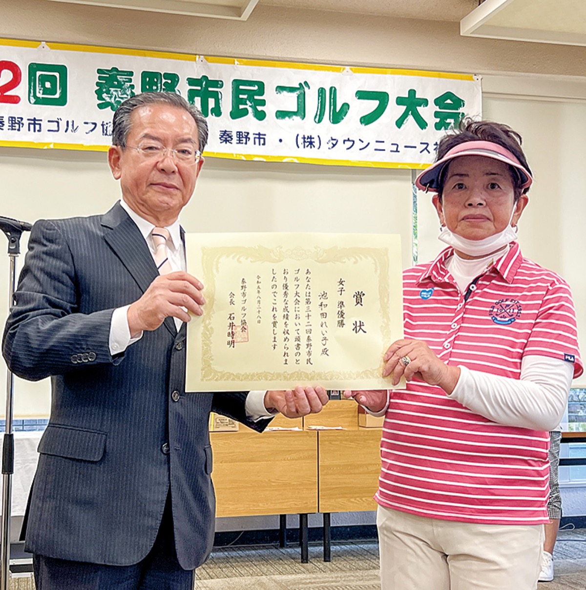第32回秦野市民ゴルフ大会が8月28日、大秦野カントリークラブで行われた。今年は94人が参加。昨年までは感染症予防のためハーフだったが、今年は18ホールでのラウンドとし、表彰式も行われ大会は盛り上がりを見せた。主催の秦野市ゴルフ協会・石井時明会長は「暑い中のプレーだったが、1人の棄権もなく終了できた。今後も皆さんに楽しんでいただける大会にしていきたい」と話した。入賞者は次の通り(敬称略)。【総合】▽優勝/梶田正喜(N(ネット)68・2)▽2位/阿立信昭(N68・4)▽3位/矢代裕樹(N68・4)【女子】▽優勝/向原由美子(N70・8)▽2位/池和田れい子(N72・0)▽3位/小野妙子(N73・2)【ベスグロ】▽男子/秋山卓(OUT38・IN36)▽女子/池和田れい子(OUT41・IN39)